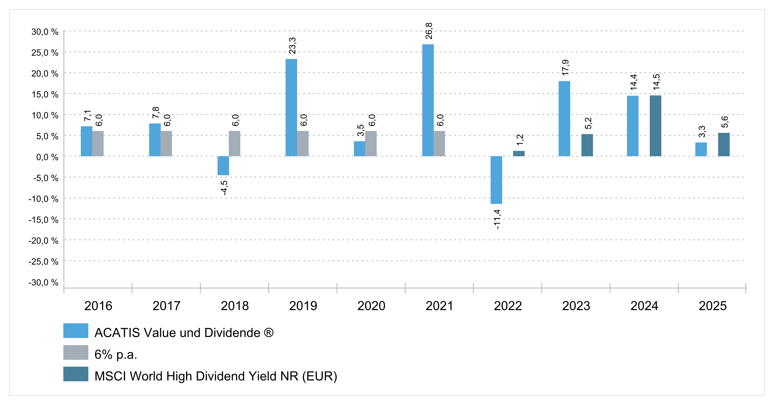 Der Fonds verfolgt einen aktiven Managementansatz mit Bezug zu einer Benchmark (MSCI World High Dividend Yield Index (EUR)) im Zusammenhang mit einer performanceabhängigen Gebühr und fördert ökologische/soziale Merkmale iSd. Artikels 8 der VO (EU) Nr. 2019/2088 („Offenlegungsverordnung“). Bei der Auswahl der Vermögenswerte werden überwiegend soziale und ökologische Ausschluss- und Qualitätskriterien angewendet. Der Mindestanteil an Investitionen in ökologisch nachhaltigen Wirtschaftstätigkeiten im Sinne der Taxonomie-Verordnung beträgt 0 %.