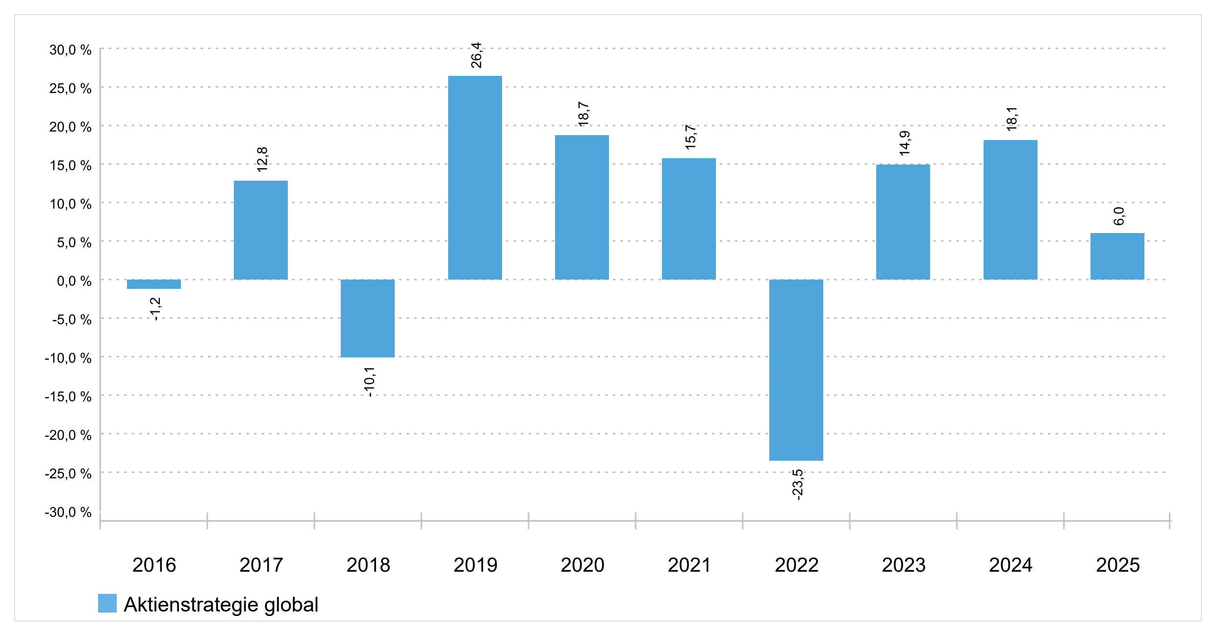 Ziel der Anlagepolitik ist auf lange Sicht die Erwirtschaftung eines Wertzuwachses unter Inkaufnahme hoher Wertschwankungen.