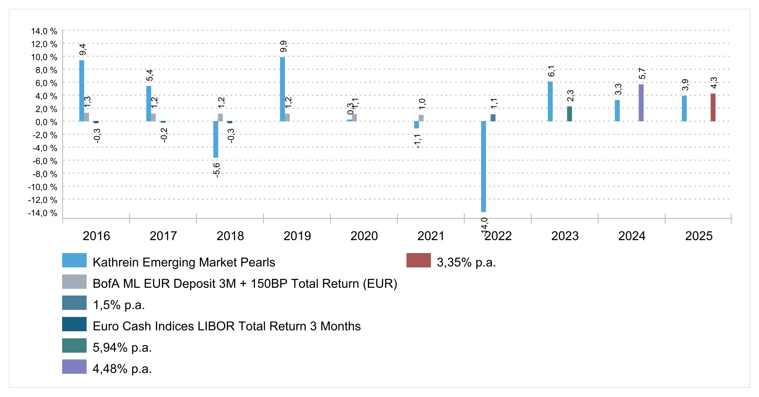 Der Fonds ist ein Anleihenfonds und investiert mindestens 51 % des Fondsvermögens (FV) in Schuldverschreibungen von Unternehmen mit Sitz oder mit Geschäftstätigkeit in Emerging Markets in Form von direkt erworbenen Einzeltiteln, sohin nicht indirekt oder direkt über Fonds oder über Derivate. Die Schuldverschreibungen unterliegen hinsichtlich ihrer Ratingeinstufung keiner Einschränkung. Das Fremdwährungsrisiko des Fonds ist mit maximal 49 % des FV begrenzt, wobei gegen Euro abgesicherte Fremdwährungsbestände dem Euro-Bestand zugeordnet werden. Ebenfalls können bis zu 10 % des FV Anleihenfonds und Geldmarktfonds jedweder Branche und Region erworben werden. Der Fonds kann außerdem bis zu 49 % des FV in Geldmarktinstrumente und Schuldverschreibungen, welche von Regierungen oder anderen Stellen ausgegeben werden können, sowie Sichteinlagen und kündbare Einlagen investieren.